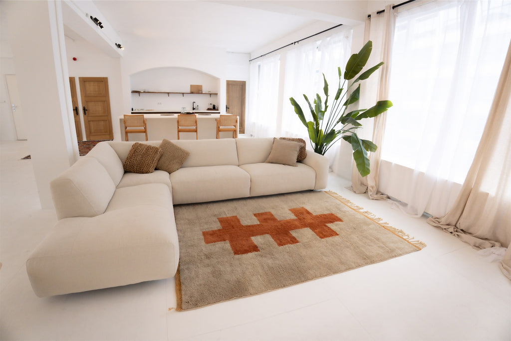 The inspiration for the Crosses rug is the cross. The design shows three crosses that are connected in unity. The rug is handmade in Beni M'rirt from 100% pure new wool and colored with natural raw materials.